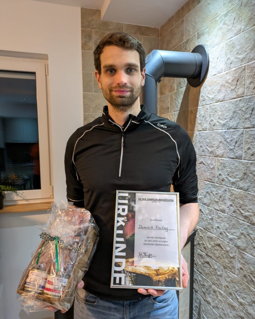 Bei winterlichen Bedingungen machte sich unser Zuchtfreund Dominik Freitag auf den Weg zur 45. Gruppenschau der Gimpeltaubenzüchter Gruppe Süd in Neuendettelsau. Und es lohnte sich! Mit hervorragenden Ergebnissen sicherte er sich den Zuchtpreis für das Jahr 2025 der Gruppe Süd. Herzlichen Glückwunsch, Dominik, zu dieser tollen Leistung!